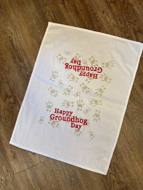 Celebrate Punxsutawney Phil and the spirit of Groundhog Day with this charming tea towel. 100% Cotton tea towel features playful groundhog paw prints and bold red lettering that reads, "Happy Groundhog Day".
