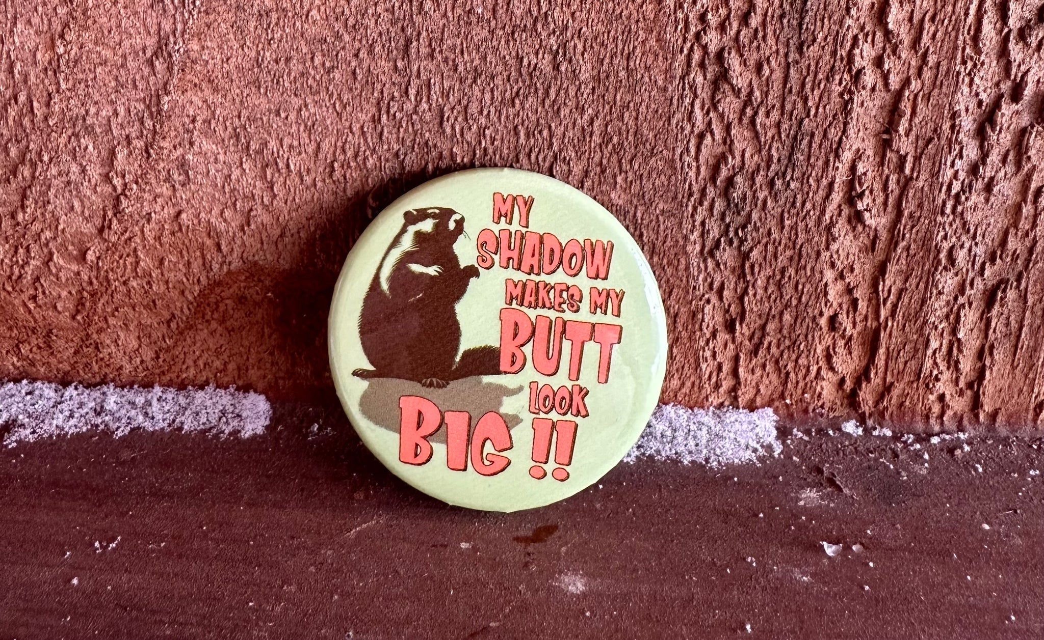 This 1½" button features the funny saying “My Shadow Makes My Butt Look Big” a playful, lighthearted accessory that’s sure to get laughs. Perfect for Groundhog Day fans, Phil Phans, or anyone with a great sense of humor, it’s easy to pin on jackets, hats, backpacks, or lanyards for an instant dose of fun.