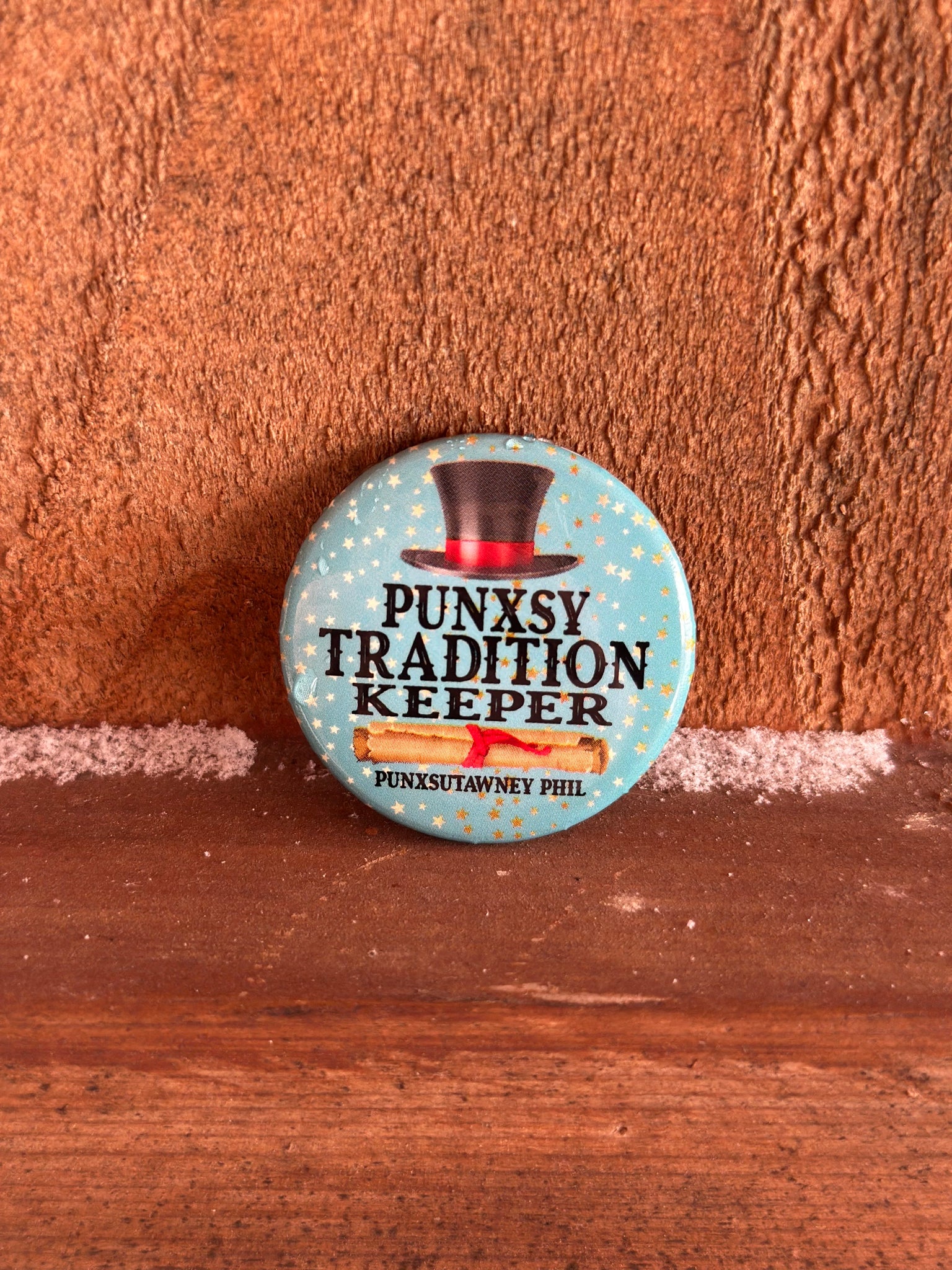 This 1½" button says “Punxsy Tradition Keeper” and features a classic top hat and scroll design, celebrating the rich history and traditions of Punxsutawney. A perfect accessory for devoted Phil Phans and Groundhog Day enthusiasts, it’s great for pinning to jackets, hats, backpacks, or lanyards to show your pride in keeping the tradition alive.