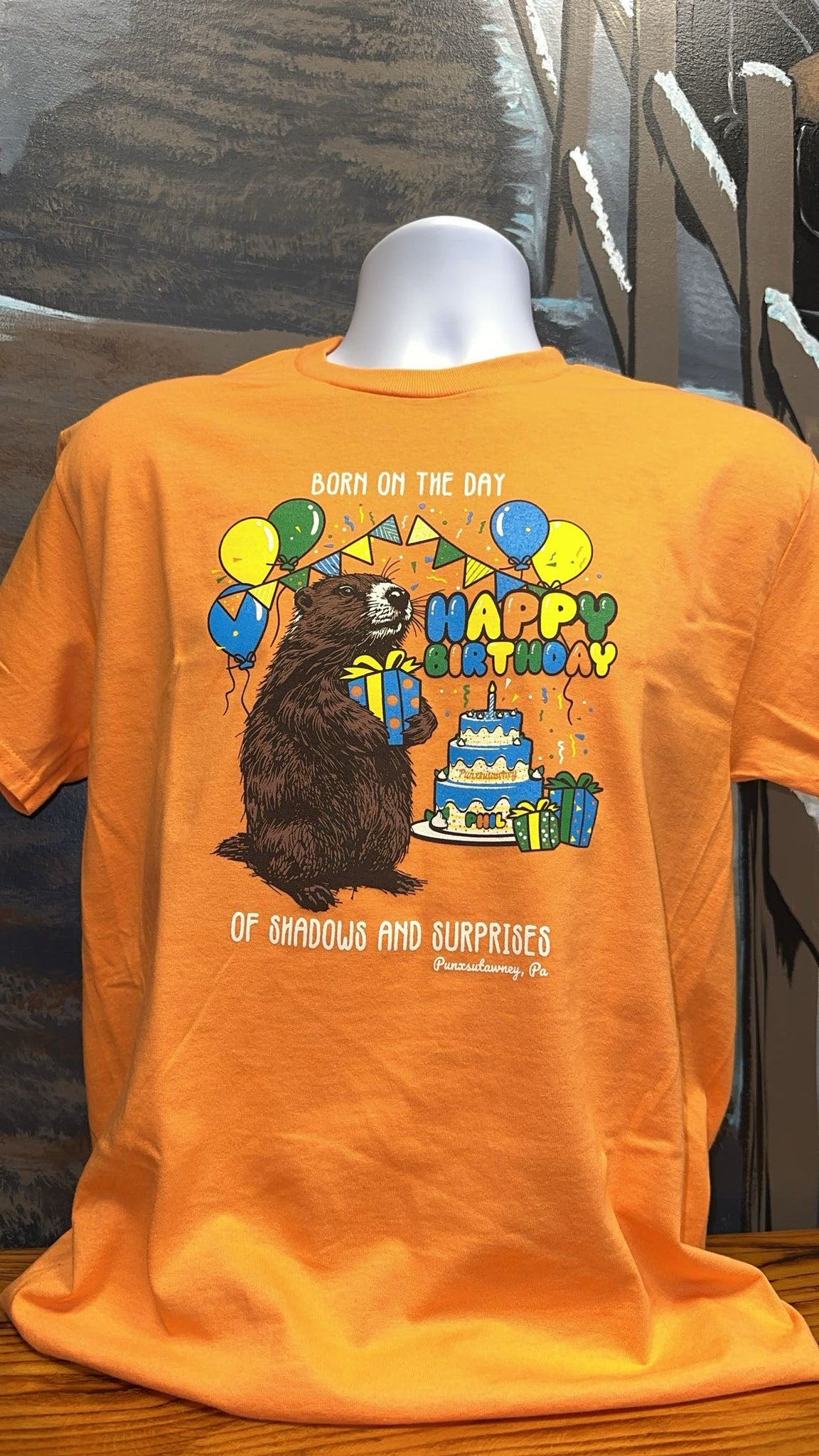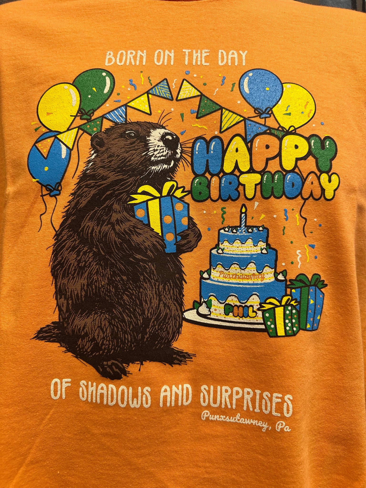 Celebrate a Groundhog Day birthday in style with this vibrant Tangerine Birthday T-Shirt! Featuring a festive groundhog, balloons, and cake with the phrase “Born on the Day of Shadows and Surprises,” it’s a fun and colorful way to mark a February 2nd birthday. Soft, comfy, and perfect for any Punxsutawney Phil fan.